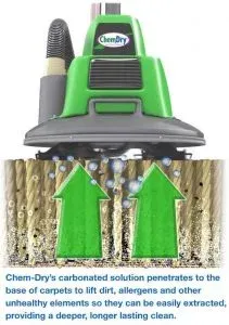 Due to the natural power of carbonation, Chem-Dry does not have to use excessive amounts of moisture to clean your carpet or upholstered items. Because the bubbles do the work for us, Chem-Dry does not need to use soapy cleaning chemicals other cleaners or do-it-yourself machines rely on so much. Soapy residues attract dirt like a magnet, causing your carpet to get dirty again faster than before.